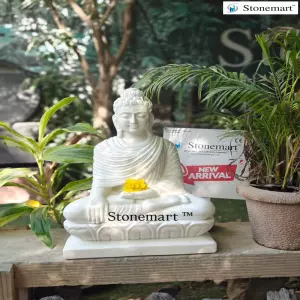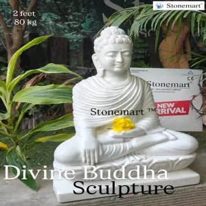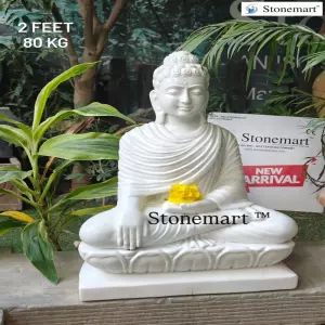 2 feet Bhumisparsha Buddha statue in white marble for your beautiful home and garden from Stonemart ™. Hand carved from snail crown on top of the head to immaculate carvings across the robes on the body, with padmasana lotus base symbolizing enlightenment. The confident and composed expression on the face of the Buddha Ji deserves a special mention. The long ears of the Buddha accentuates the fact that one should emphasize more on listening rather than talking.