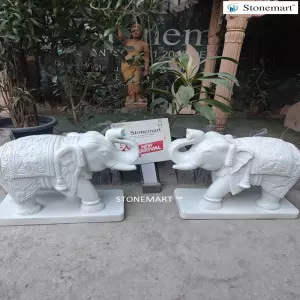 Fully handcarved out of a single block of white marble stone block, these elephant statues are naturally heavy due to non-hollow stone composition. Vastu Friendly with trunk upwards, they symbolize happiness, good luck, prosperity and abundance of fortune in the bearer's life.