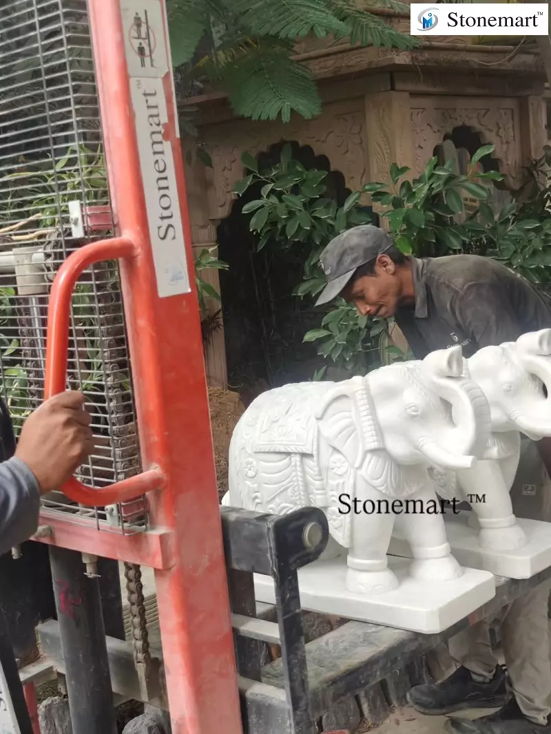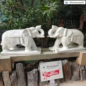 The majestic elephant statues 2ft fully carved by hands out of international quality white marble stone to bring out something auspicious, Vastu friendly and extraordinary in terms of decor from Stonemart ™. Order now something special for your home, outdoor garden, or business building or as showroom entrance elephant statues out of stone which is naturally heavy and not hollow by Stonemart ™.