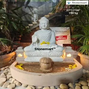 The sitting Buddha statue in abhaya mudra has been mounted upon a natural sandstone fountain tank and Japanese lantern that can be placed each beside the statue and radiating it with light across the vicinity during evening, night times and wee hours. The presence of this Buddha sculpture removes the negative energies from the property and instills fearlessness and confidence into the person. A set of 100% 'atmanirbhar Bharat' made in India products, we only display images and authentic videos of the products that are hand carved in our own factories. You will never find stock images published on the website when you are ordering at Stonemart™. We only offer authentic deals of authentic products that are being hailed in international markets for nearly two decades.