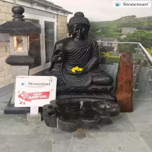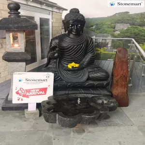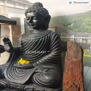3 feet black marble stone Buddha sculpture in abhaya mudra posture for home and garden by Stonemart ™. One of the most popular and easily recognizable gestures of the Buddha, it is commonly associated with the dhyani Buddha 'Amoghasiddhi'. The mudra symbolizes positive energy, fearlessness and confidence in the daily aspects of your life.