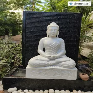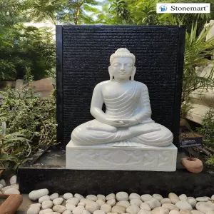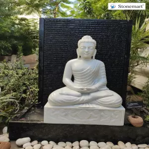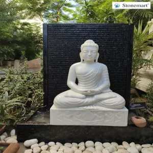 Beautiful granite waterfall with serene hand carved Buddha statue to bless your home with positivity, happiness and peace. Order online 3 feet Granite fountain with 2 feet White marble Buddha statue in Dhyana or Meditating Mudra from Stonemart™.