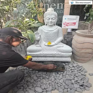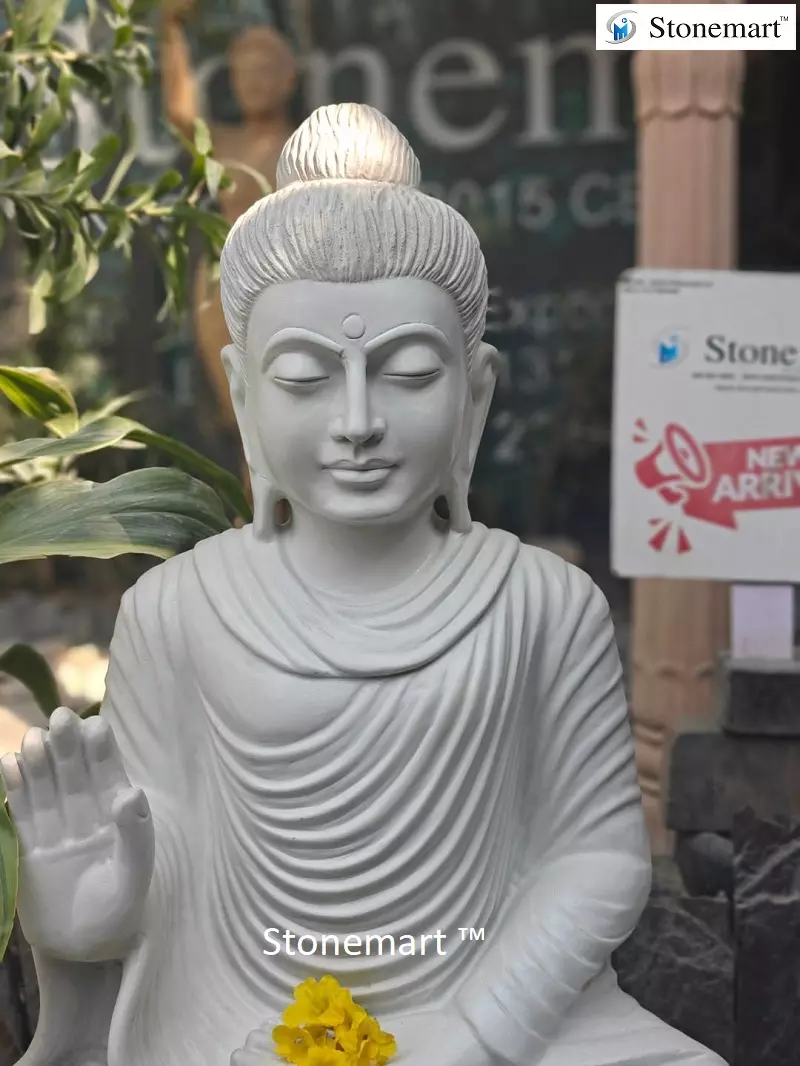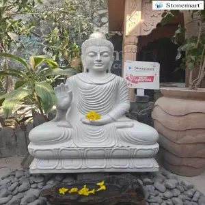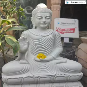 Divine stone Buddha sculpture for your home, garden, resort, farmhouse and commercial establishments by Stonemart ™. It's fully handcarved out of a single block of white marble stone in abhaya mudra posture. It is naturally heavy and not hollow from inside. Making the deity sculpture highly credible in terms of durability both indoor and outdoor.