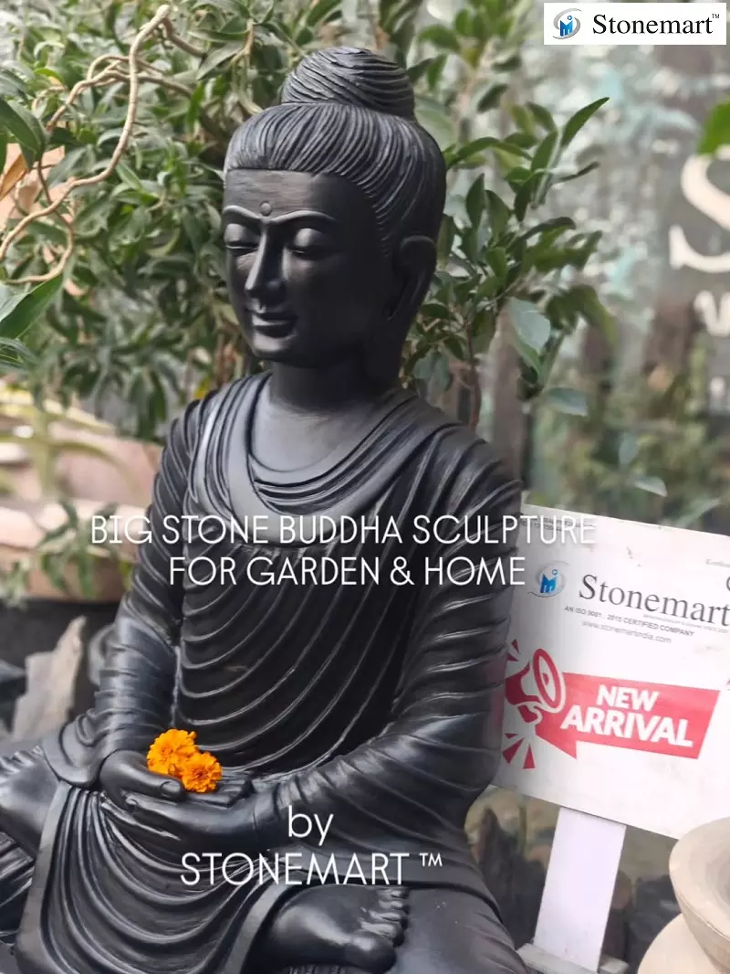 Grand in size yet peaceful in gesture. 4 feet dhyana mudra black marble Buddha sculpture for indoor and outdoor by Stonemart™.