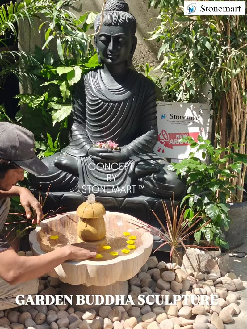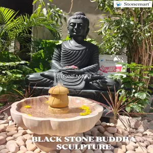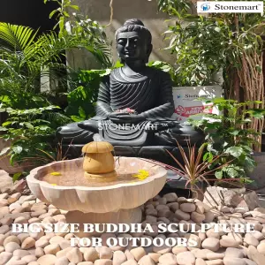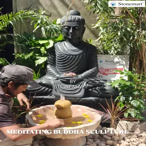 It is considered a powerful symbol of stable mind, representing the Buddha Amitabha's ability to dispel uncertainities and protect against negative energies. This black marble 4ft statue of Buddha encourages a serene atmosphere, helping to alleviate anxiety and create a tranquil environment, suitable for both garden and indoor setting.