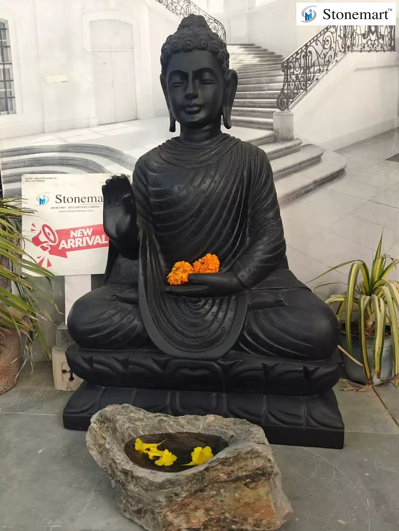It's 3 feet fully handcarved out of premium quality black marble stone in abhaya mudra posture by Stonemart ™. Personified by Amoghasiddhi, one of the five dhyani Buddhas symbolizes positivity, fearlessness and profound confidence in life.