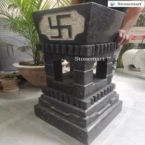 Highly divine Tulsi Vrindavan or Tulasi Kota with Swastik, it has been handcarved by the hands of the most skilled murtikars of Stonemart ™ and has been prepared as per the principles of Shilpa Shastra and meant to boost the positive vibes of Vastu. Beautiful symbol of Swastika can be seen engraved on the surface of the planter with provisional space lighting diyas (Indian oil lamps) at the base of the Tulsi Kota.