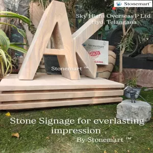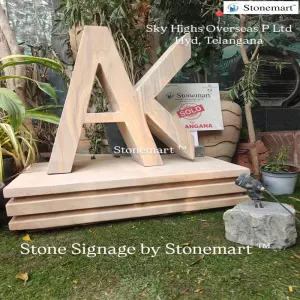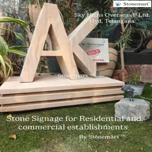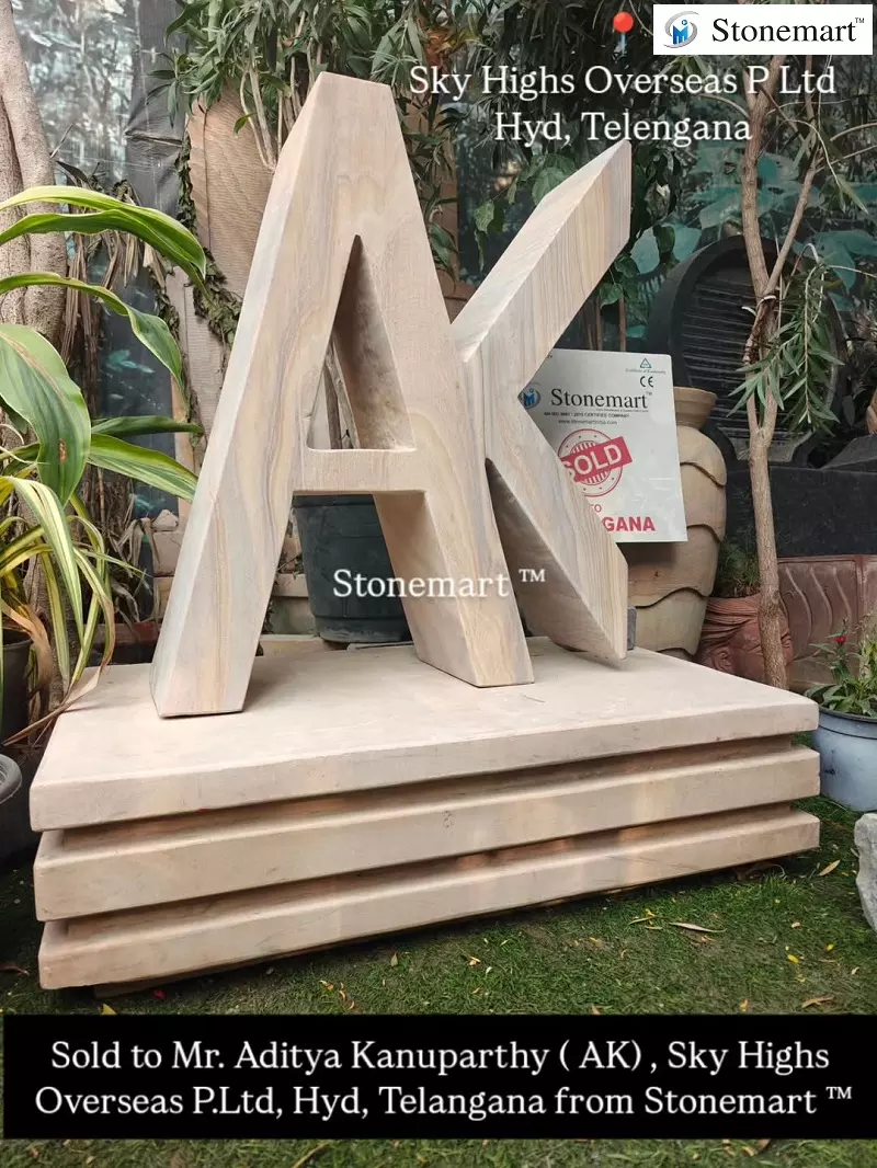 Stone signage manufactured on the online order of our client and dispatched via our shipment services to Sky Highs Overseas Private Limited, Hyderabad, Telangana from Stonemart ™. Hand carved in stylized alphabet "AK" stone signage beautifully manufactured by the most gifted native Indian stone craftsmen. The letters mounted upon the pedestal (as show in the video and images above) increases the aesthetics, height and visibility.