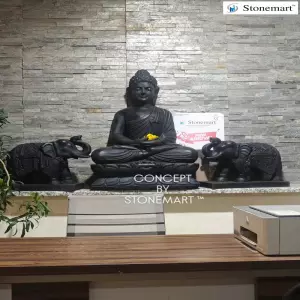 Invite positive Vaastu to your commercial office space and home office. Handcrafted 3 feet black Buddha statue with 18 inch Elephant statues for office Vastu by Stonemart™ India.