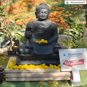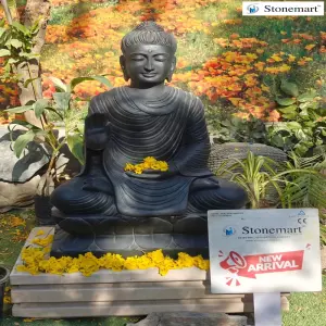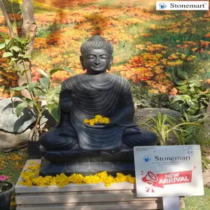 Garden Buddha statue totally hand crafted out of premium black marble stone by none other than Stonemart ™. It's fully handcarved stone Buddha sculpture in Abhaya Mudra Posture by Indian murtikars for your beautiful home entrance.