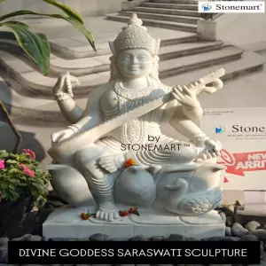 A white marble Saraswati statue in an educational institution symbolizes the pursuit of pure knowledge, wisdom, and enlightenment, acting as a source of inspiration for students and educators. White marble represents purity, peace, and sattva (clarity), while Saraswati embodies learning, arts, and intellect, creating a serene, focused atmosphere conducive to study.