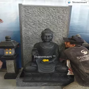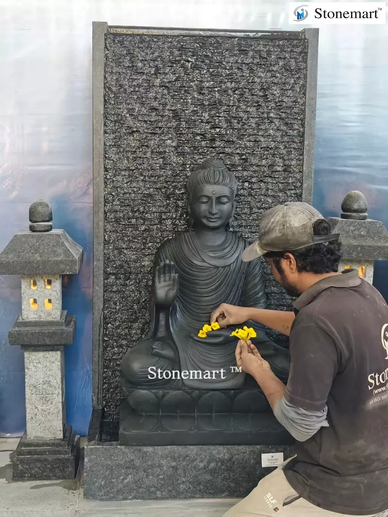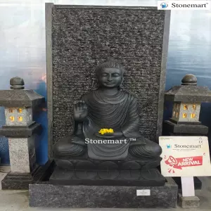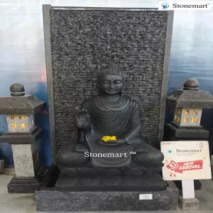 Mounted on the panel fountain is 3ft Gautam Buddha statue hand crafted out of single block export quality black marble. The Buddha pose/mudra symbolizes abhaya mudra. Which is associated with positivity, confidence building and fearlessness in every aspect of life. This Buddha fountain can be sent as a perfect spiritual gift for loved ones by sitting in any part of the world. Featuring excellent packaging and shipment standards, you will get the doorstep delivery of this Buddha water feature in any part of the world.