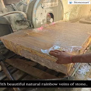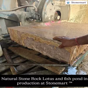 Natural stone Lotus and fish pond in manufacturing and soon available to order at Stonemart ™. Stone resembling rainbow mountains of Arizona. Observe the surface of the raw rainbow sandstone block being used for the manufacturing of this natural stone Lotus pond out of rainbow stone for your garden by Stonemart ™. Notice the beautiful stone color that resembles the mountain cliffs of Arizona in the USA making it completely stunning and extraordinary. Order today from Stonemart ™.