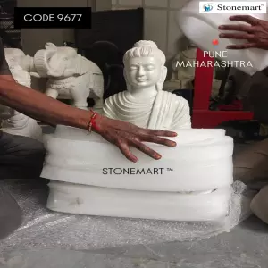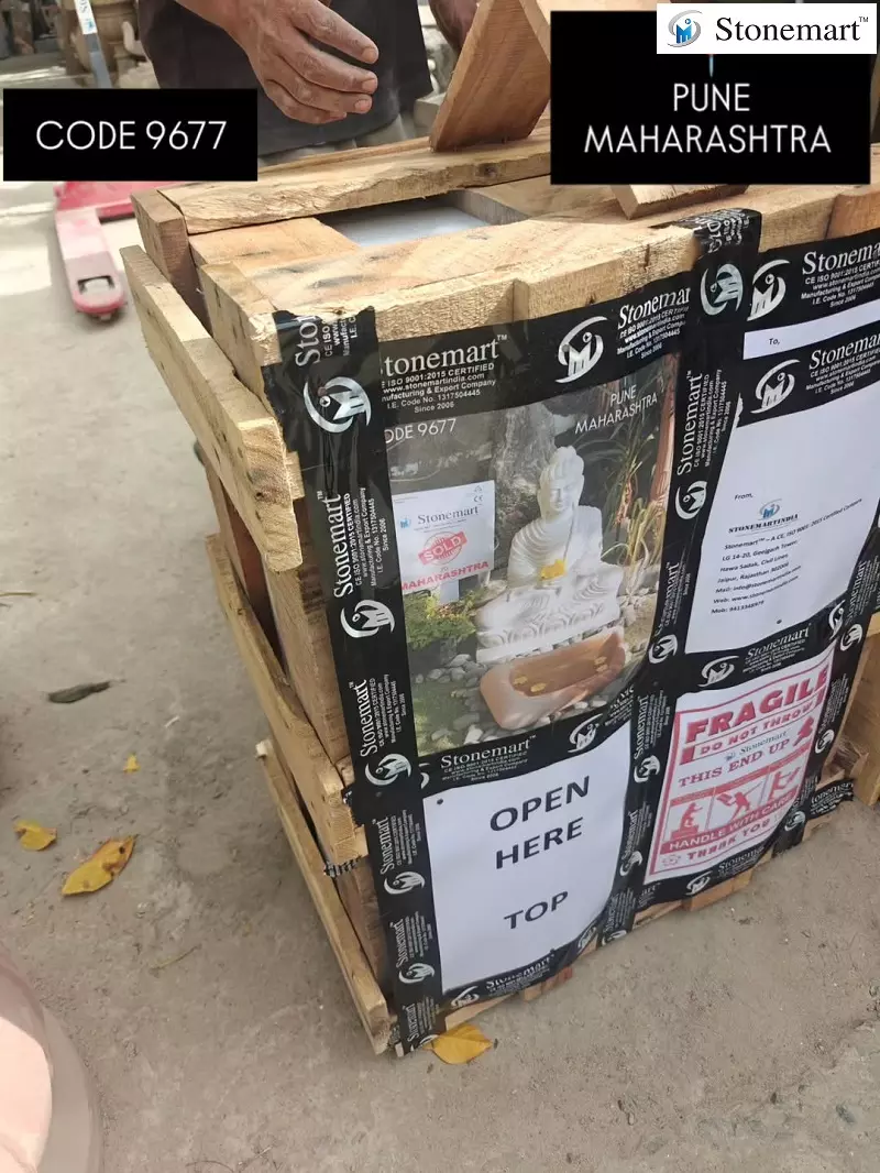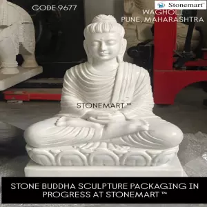 Packaging of 2 feet white marble stone Buddha sculpture for dispatch to Wagholi, Pune, Maharashtra from Stonemart ™. For outdoors, Stunning Garden Buddha sculpture out of a single block of white marble stone by Stonemart ™. It's fully handcarved with the most serene face expressions and sold to Wagholi, Pune, Maharashtra from Stonemart ™.