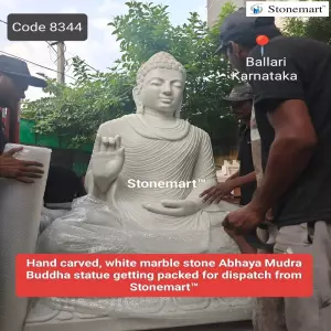 Huge like never before...6 feet, 1.5 tons abhaya mudra stone Buddha statue hand carved out of single block of white marble. It is getting packed and ready for dispatch to the client in Ballari, Karnataka from Stonemart™.