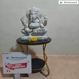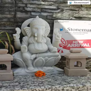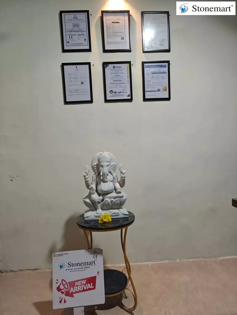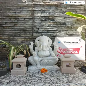 Unique natural stone Vigneshwara Sculpture for outdoors and indoors by Stonemart ™. It's pure natural stone chiseled by hand using hammer by the most gifted murtikars of India to bring out the best for you. The primary benefit of a four-armed Ganesha is the elimination of impediments in personal, professional, and spiritual life, ensuring success in all kinds of endeavors. Here, white marble signifies purity, serenity, and high positive energy. As it helps in maintaining a calm, tranquil atmosphere within the home, reducing stress and anxiety.