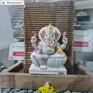 Let's have a look at characteristics of this white marble Ganapati idol with rainbow sandstone panel fountain: