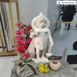 One can only find the blessings of lord Ram through Ram-doot Hanuman. Such is the formidable connection between the two rooted upon mutual love, respect and devotion. This 1.5 feet high Hindu God statue of Maruti is a testament of exceptional stone masonry seldom achieved upon natural white marble texture. The beautiful crown, the divine halo, the mace and the richly carved ornaments and robes, this blessing Hanuman statue is the hallmark of the most skilled and gifted hands. All the credit goes our shilpakars at Stonemart™ and the blessings of lord Ram. Place this standing Anjaneya statue to get bestowed with strength, to ward-off negative energies as well as for Shani dosh nivaran (eliminating negative influence of planet Saturn).