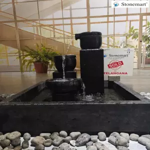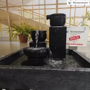 Have a glimpse into the images and the videos and feel the cascading flow of water. Sitting in front of it would rejuvenate the senses and feels like heaven. The fountain opening of this luxury fountain is provided at the top has been hand carved in the form of a single granite pitcher from which the water pours and cascades down to the tiers below in the shape of granite uruli pitchers.