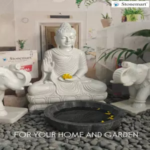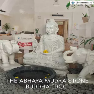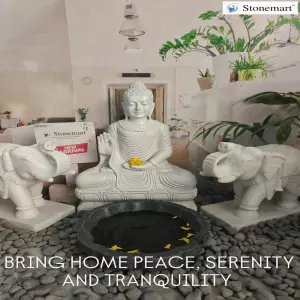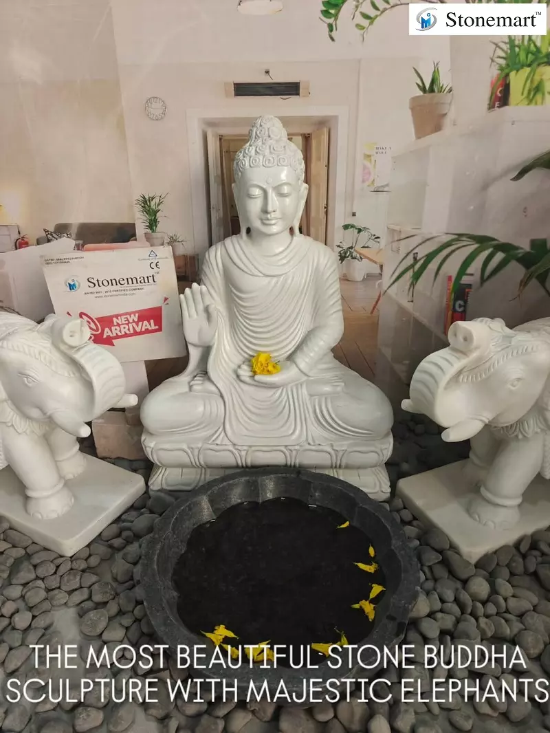 WATCH IT LIVE 👇:This explains why the age old stone carving art of India is still renowned and rather worshipped all around the world. The beautiful Handcarved 3 feet Abhaya Mudra White marble stone Buddha sculpture with a pair of 2 feet white marble stone elephant sculptures by Stonemart ™. Bring home peace, serenity, beauty by ordering this beautiful setup from Stonemart ™.