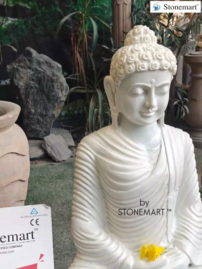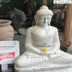 One of the most stunning pieces of masterworks ever created by our God-gifted murtikars. Statue of Buddha carved out of a single block white marble stone by Stonemart ™ sculptors in dhyana mudra. According to Vastu Shastra and Feng Shui, the mudra is symbolically associated with peace, mindfulness, clarity in thoughts and judgments.