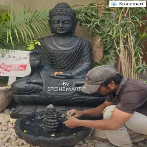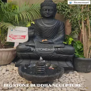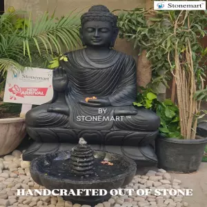 Large Size stone Buddha sculpture for outdoor garden and home by Stonemart ™. Carved fully by hand using hammer and chisel out of black stone, this Abhaya Mudra Buddha sculpture is perfect example of age old stone carving art of India.