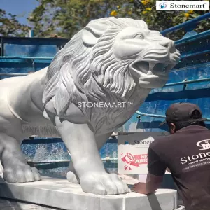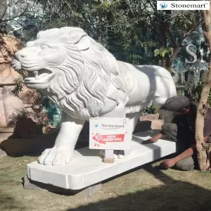 GARDEN SCULPTURES SO LIVELY, 6 FEET OVER 1.5 TONS LION HANDCARVED OUT OF A SINGLE BLOCK OF WHITE MARBLE STONE BY STONEMART ™. Witness the most intricate detailing and stone carving on the majestic big size lion sculpture for your commercial establishment, farmhouse, garden or home.