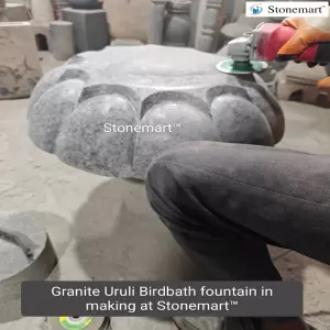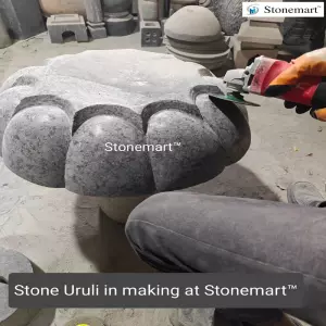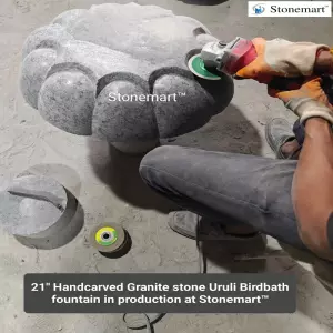 Hand carving 21 inch black granite stone beautiful urli bowl perfect for home and garden. Arguably one of the best Sellers, its utility is not merely confined as a fountain but also as a bird bath for installation at garden, lawn, balcony and terrace from Stonemart™. Just look at the hand crafted perfection with which the base of the uruli bowl is getting carved. The correct balance of the urali base is essential the desired stability to the water feature.