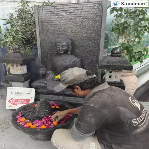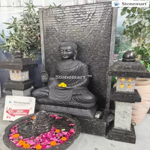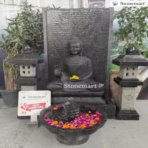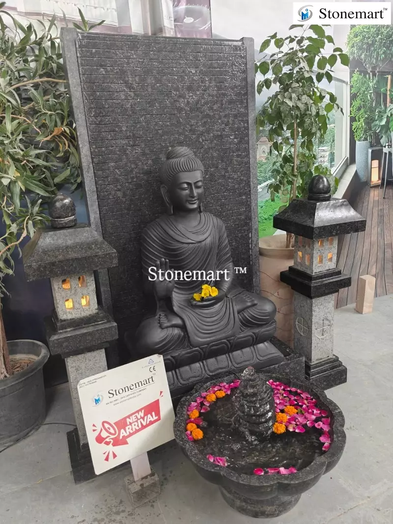 WATCH IT LIVE 👇:Buddha fountain for home, garden, resort, hotel, farmhouse and commercial establishments by Stonemart ™. Fully handcarved out of black granite and marble Buddha fountain 5 feet 720 kg with a pair of 3 feet granite Japanese pagoda lanterns, uruli birdbath fountain by Stonemart ™. Beautiful handcarved 3 feet 180 kg Black marble stone Abhaya Mudra Buddha statue placed on 5 feet 520 kg granite waterfall to bring out the most exquisite Buddha fountain for you. Buy granite Buddha fountain online from Stonemart ™.