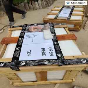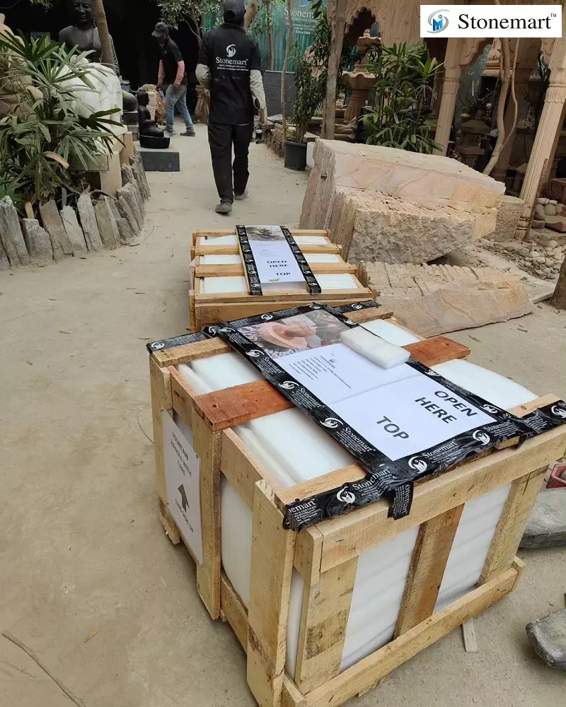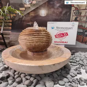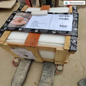 Getting packed the natural sandstone sphere water fountain and ready for dispatch to Mumbai, Maharashtra. Experience domestic packaging in India as per international standards only at Stonemart™. The sections of the fountain are packed seperately in 1 inch thick foam sheets and bubble wraps and external safeguard is offered with the help of thick, robust wooden crate. The loading and unloading of the package is also handled by professionals only. Once reach, you can open the package easily as per the professionally written instructions on the external box surface.