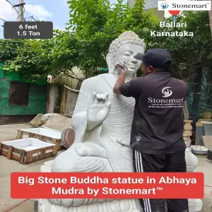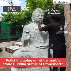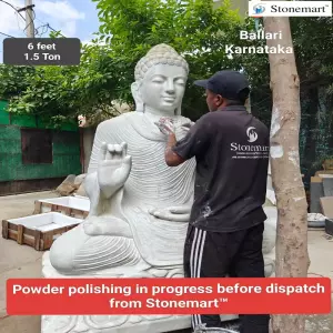 Marble sculpture of the Buddha in abhaya mudra undergoing its ultimate phase of manufacturing. It is a moment of magical creation to see how a single block marble has been transformed into deity at Stonemart™. That is what the hands of our most gifted Indian murtikars have accomplished for you through passion and perseverance of our artisans. A gem of stone masonry by hands rather than the involvement of machines.