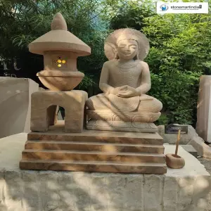 Get this sandstone outdoor Buddha with Japanese lantern for your spiritual and decor needs at home, balcony, resort, cafe, restaurants, farmhouse, office, factory, hotel, villa, spa, public parks, academic and research institutions, rehabilitation centre, Meditation or Yoga centre and for any other commercial establishment from Stonemart™.