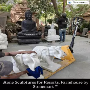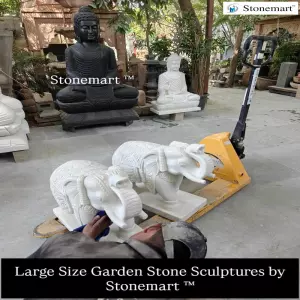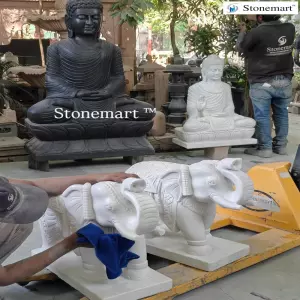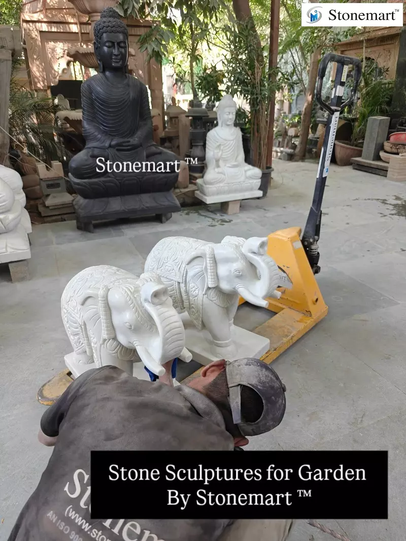 WATCH IT LIVE 👇:Stone Sculptures for Garden, resort, farmhouse and commercial establishments by Stonemart ™. In frame 5 feet 800 kg black marble stone Buddha sculpture and 3 feet white marble stone Abhaya Mudra Buddha statue ( already sold) and a pair of 2 feet white marble stone elephant statues by Stonemart ™.