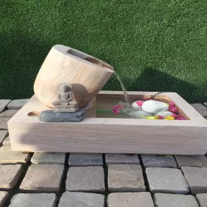 Natural stone Buddha statue with integrated state of the art tilted fountain. The fountain mouth is in the form of a modern art pitcher allowing the water to stream down to a large size fountain tank underneath. A small size meditating Buddha is an integral part of the fountain set-up and can be placed upon any of the tank edges. You can further embellish the modern decor fountain tank with pebble stones or flowers of your choice.