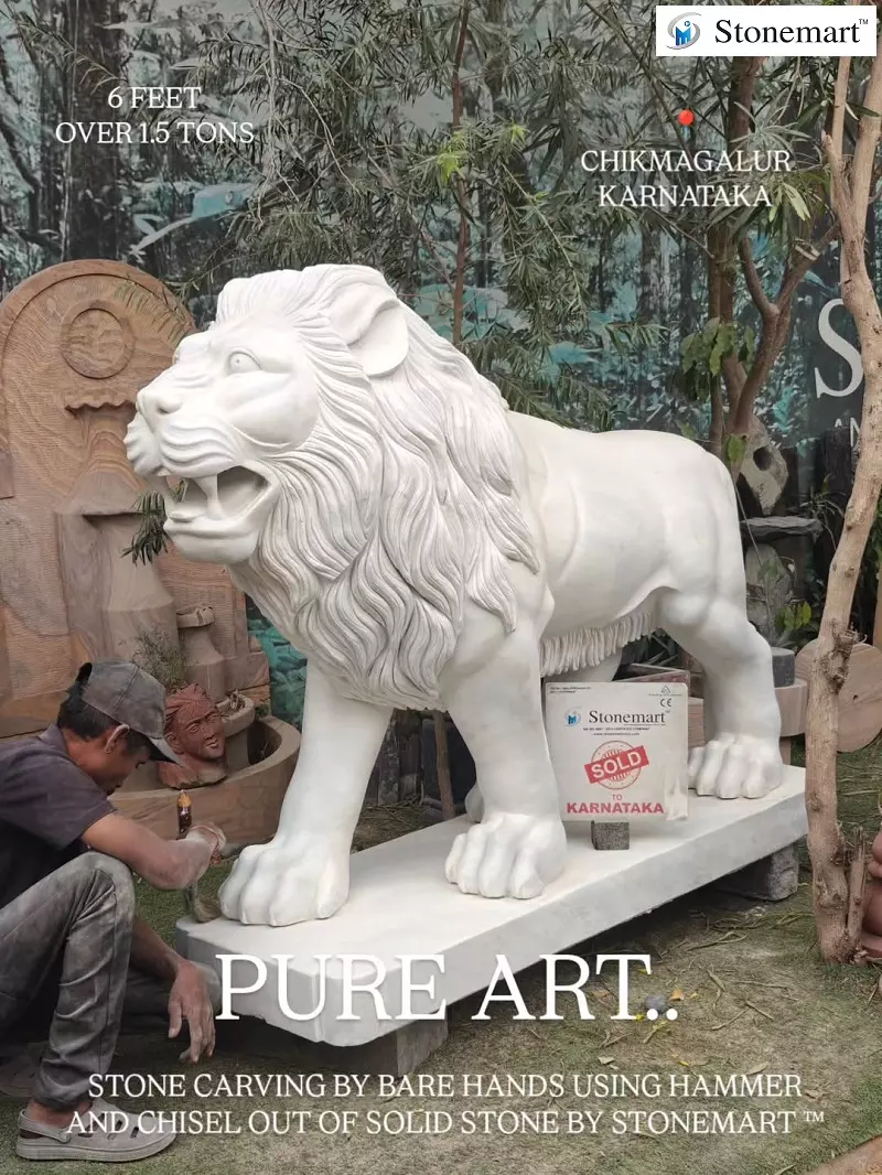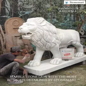 Can you imagine? It's handcarved out of one solid premium quality white marble stone to bring out this really big lion sculpture by Stonemart ™. Prepared on the special order of our client from Chikmagalur, Karnataka, this solid pure marble stone marvel reaches 6 feet and weighs over 1.5 tons in weight.